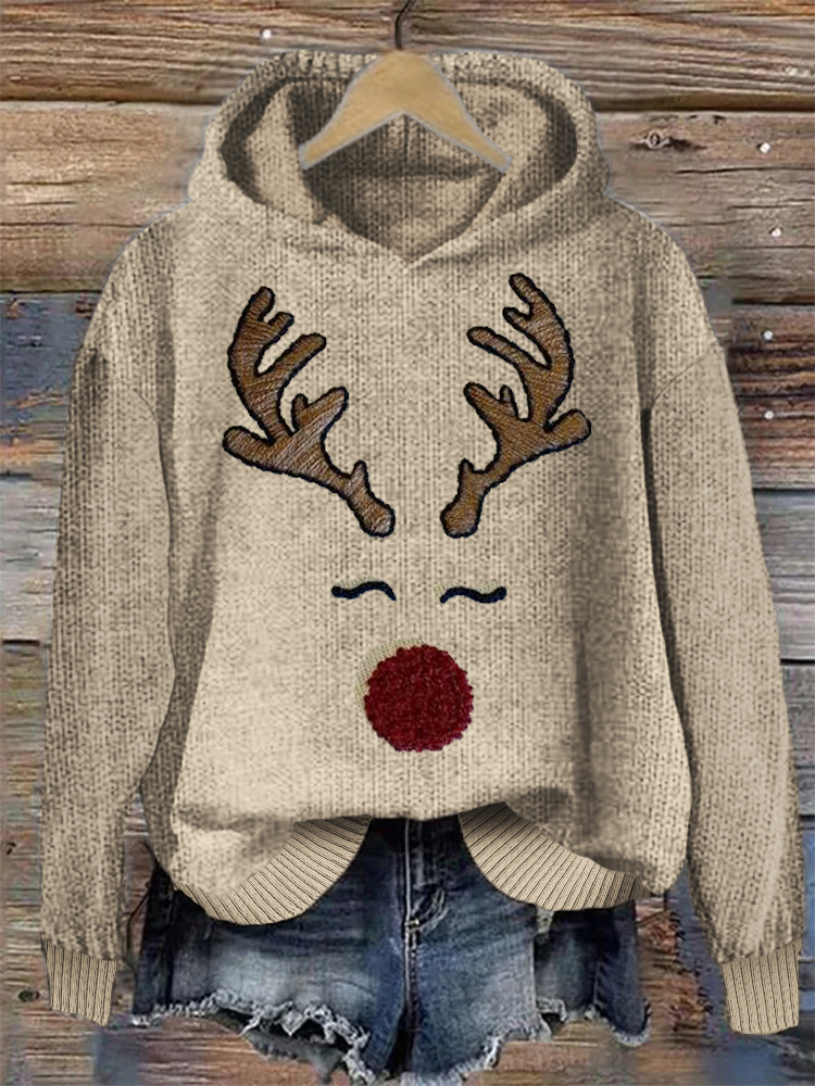 Lovely Christmas Reindeer Face Embroidery Cozy Knit Hoodie