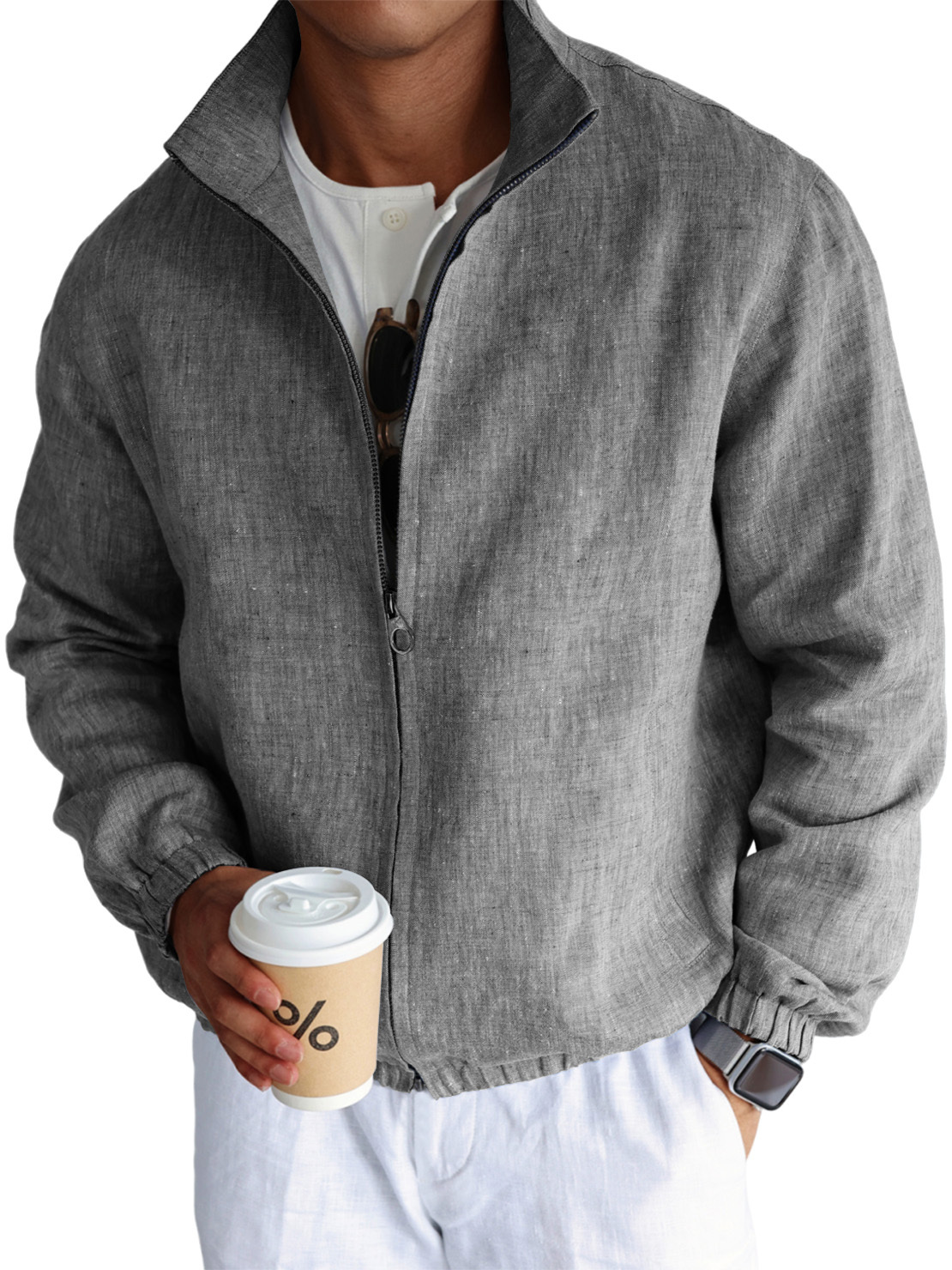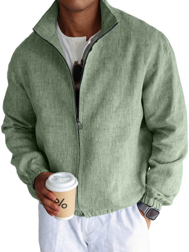 Men's Simple Casual Cotton And Linen Stand Collar Zipper Jacket