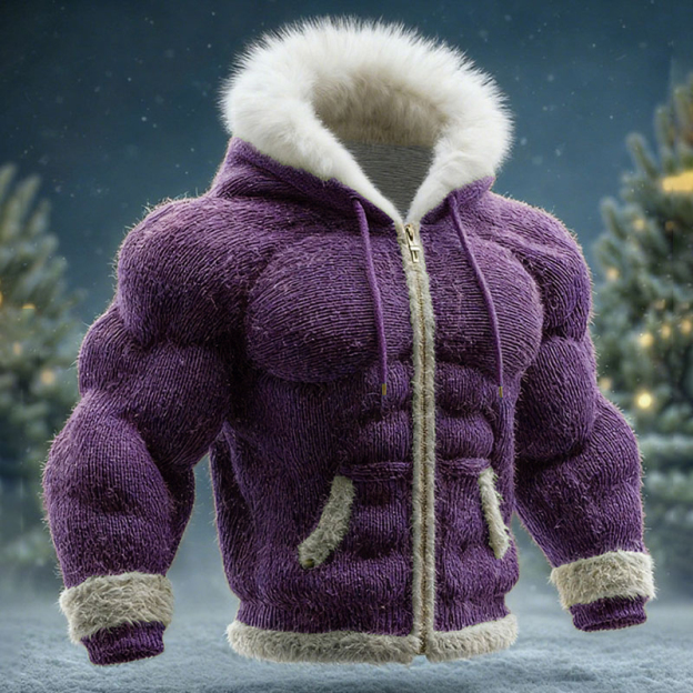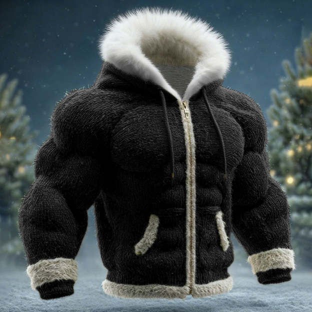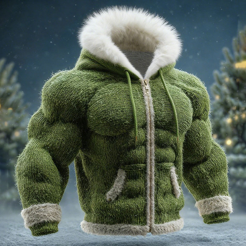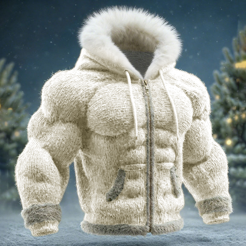 Muscle Line Art Warm Large Fur Collar Zipper Sweater