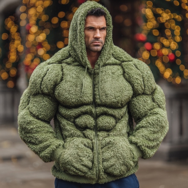 Cappotto con cappuccio in peluche verde muscolare da uomo per la stagione natalizia