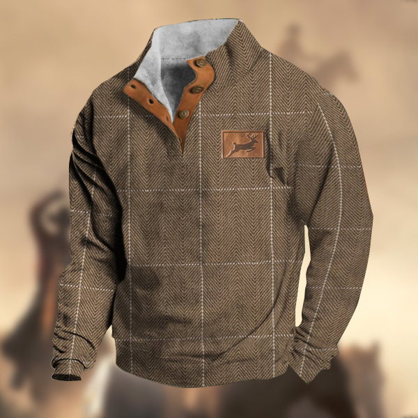 Men's 100% Cashmere Western Elk Hunting Vintage Herringbone Print Stand Collar Button-Down Sweatshirt