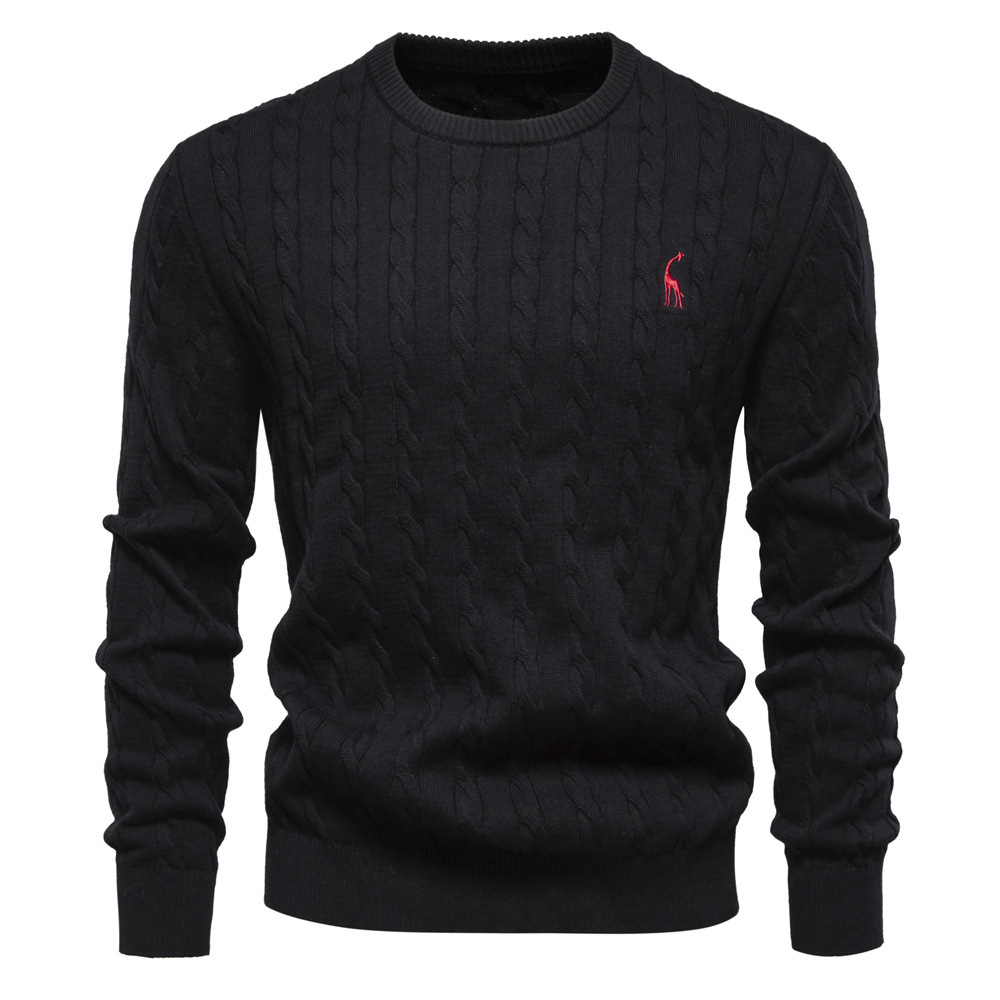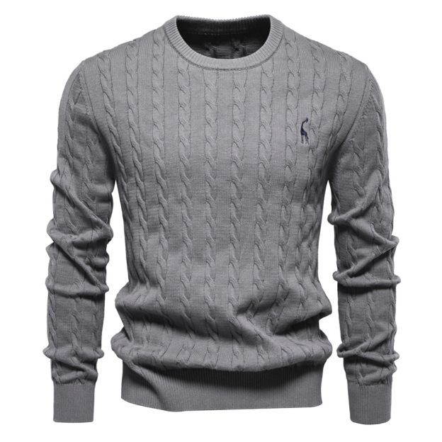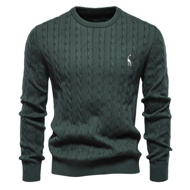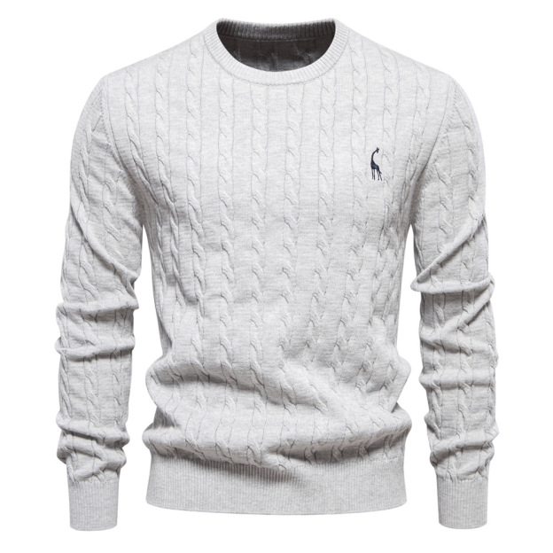 Men's Round Neck Twist Patterned Giraffe Embroidery Sweater