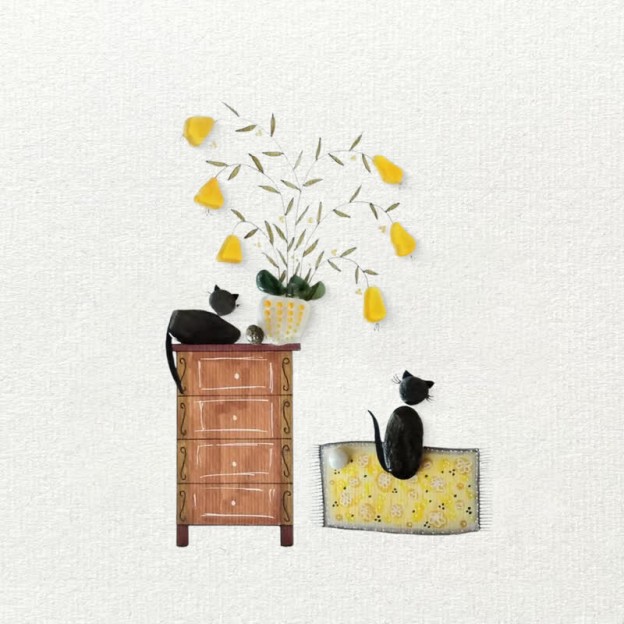 🐈‍⬛🌼Discover a scene of pure, tranquil companionship with this unique framed art piece. This artwork captures a charming indoor moment. Two black cats, one lounging on a wooden nightstand, the other resting on a yellow - patterned mat, are accompanied by a vase of bright yellow flowers.