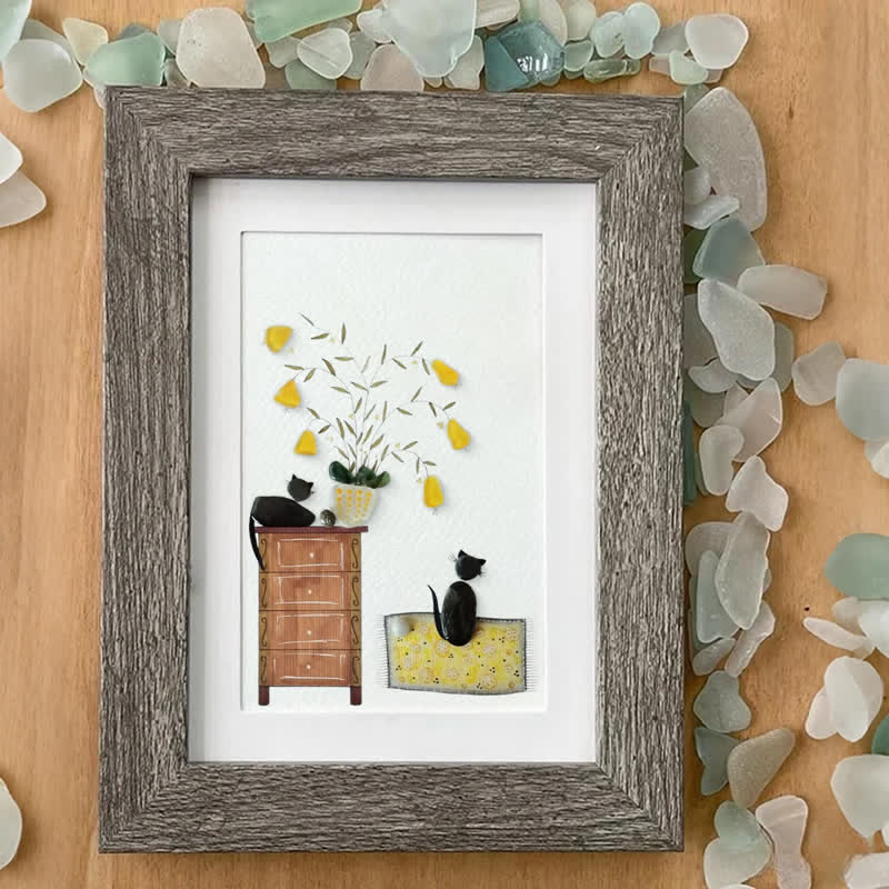 Pebble Cats And Blooming Plants Sea Glass Framed Art