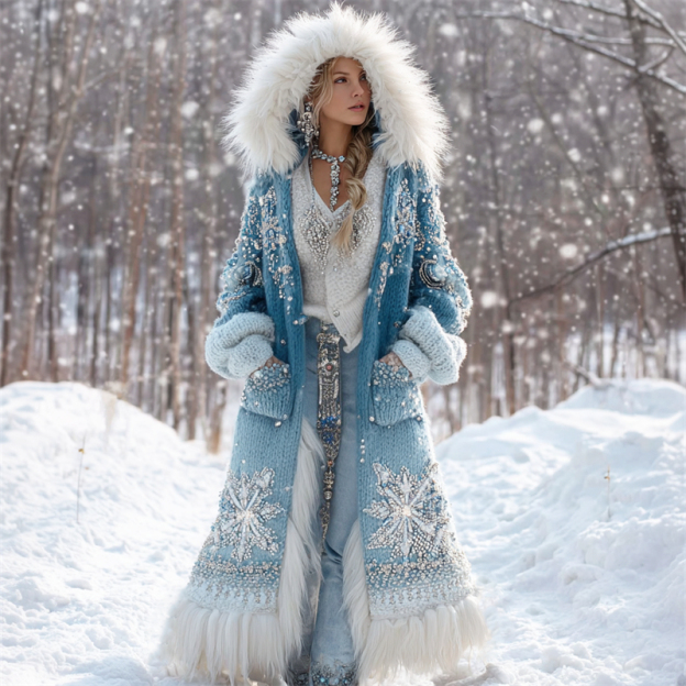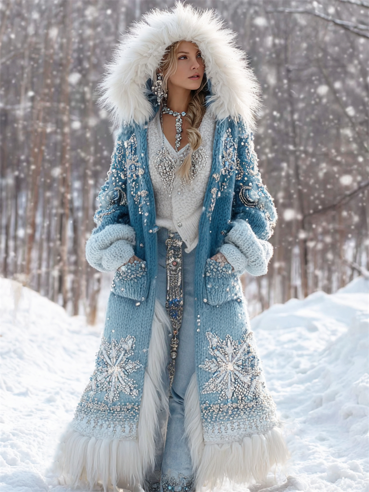 Vintage Snowflakes Beaded Gradient Fur Trim Cozy Long Cardigan