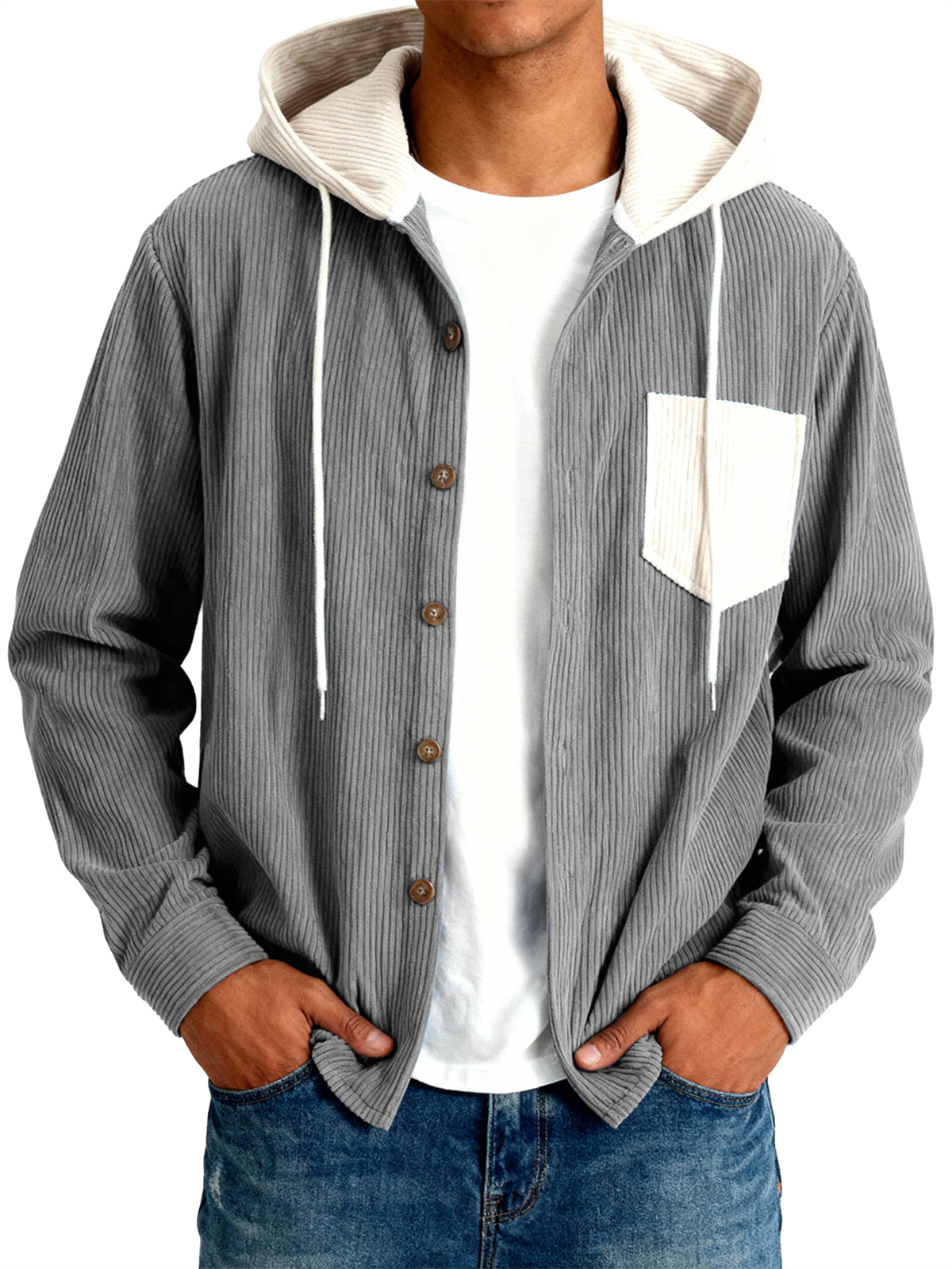Men's Vintage Casual Corduroy Colorblock Pocket Hooded Shirt Jacket